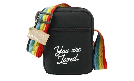 This compact RPET crossbody bag features a bold rainbow strap and a clean, modern look.
